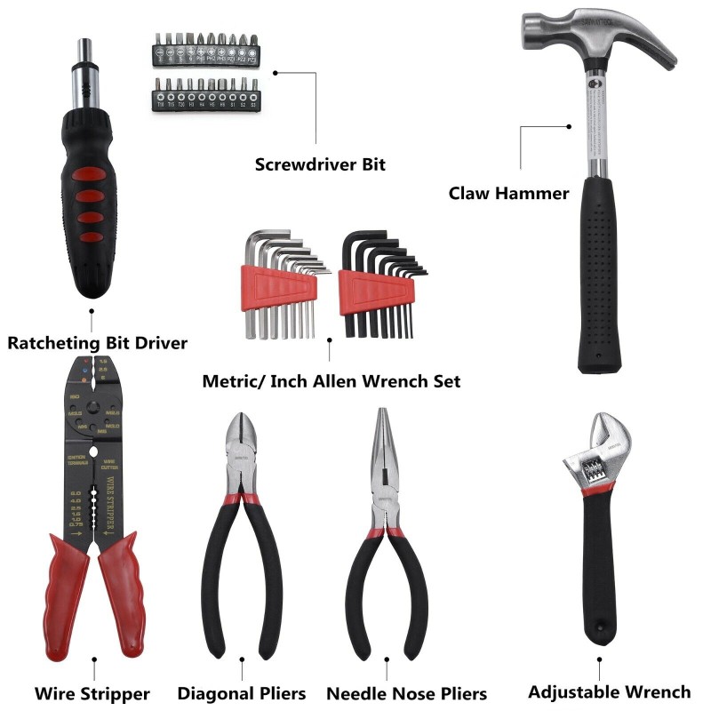 Clamp, Hammer, Hex Key, Knife, Level, Pliers, Screwdriver, Tape measure, Wrench, Tool box, Wire stripper, Snap-off knife, Fastener kit