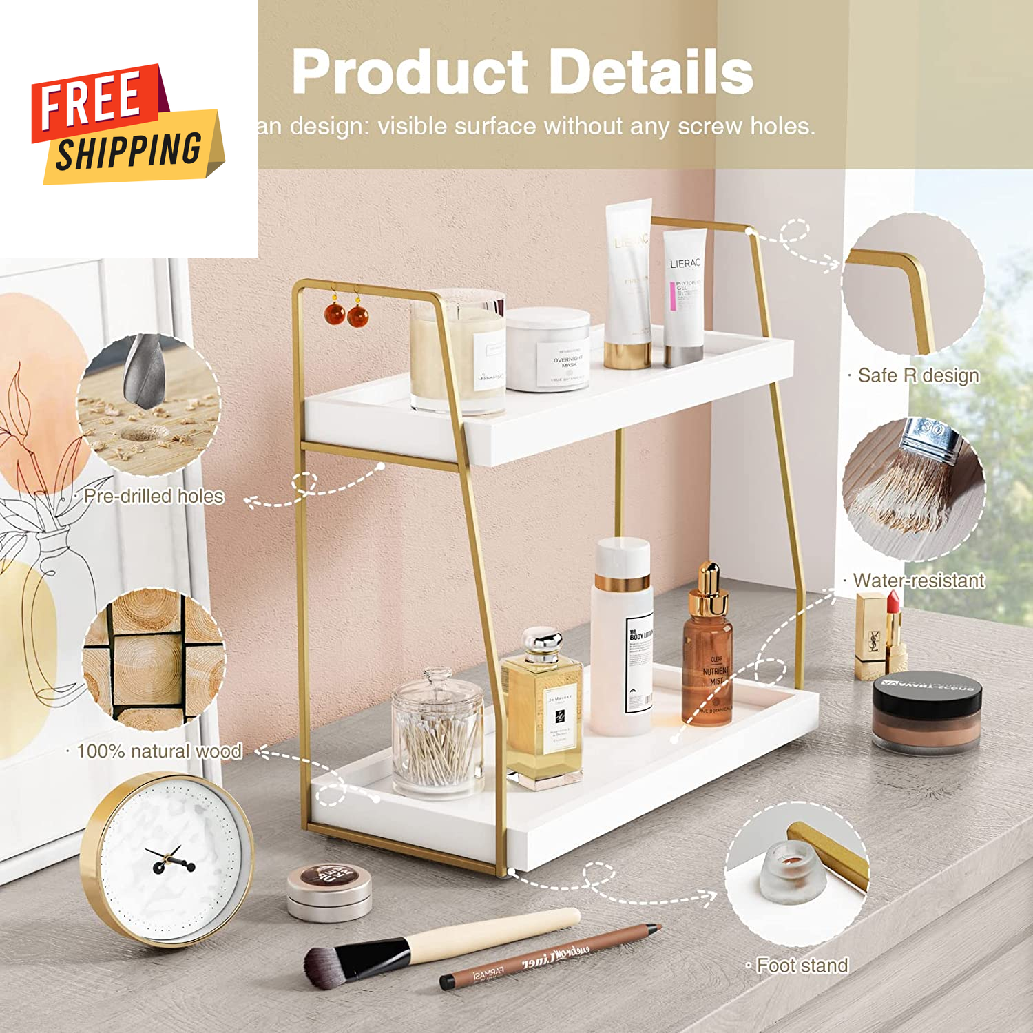 2-Tier White and Gold Bathroom Organizer Countertop - Wooden Sink Organizer Shel