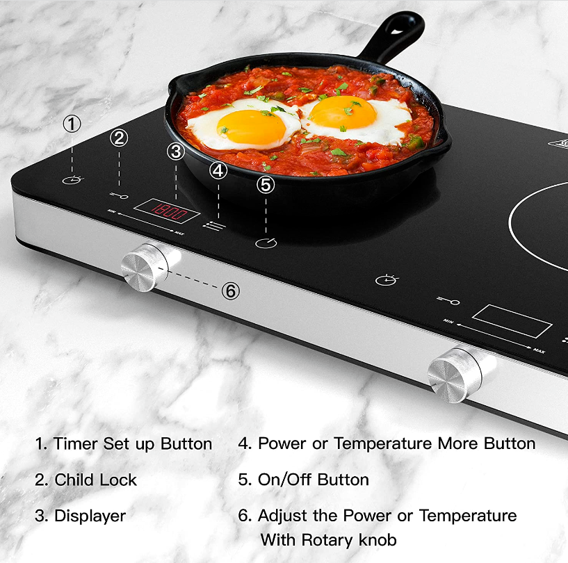 • ????? ???? ????? ????????? ???????:1800w quick heating double induction cooktop is faster than a standard double induction burner. Compared with traditional induction stove, it has a higher heat conduction effect, which meets various cooking needs, such as steaming, boiling, fried, frying, slow stewing. Through the knob operation, we can control the heat more accurately, and the ventilation duct design can better dissipate heat and prevent damage to the countertop.