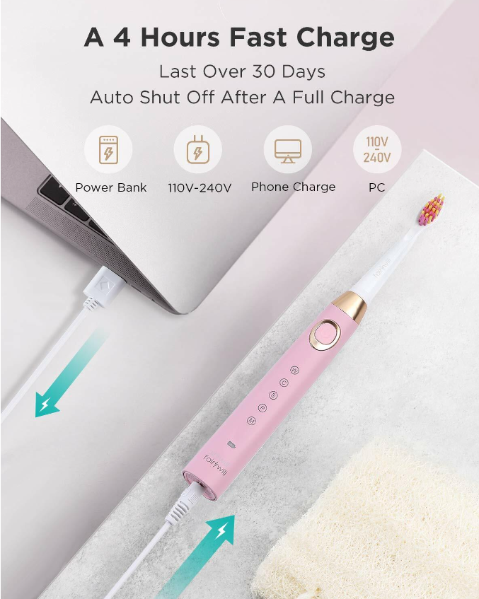 • ✅ 2 Mins Smart TIMER & A 30Days Long Lasting Battery Life - Built-in Timer with 2 mins auto shut-off and interval pause of reminding to change brushing areas every 30s helps to give you a total mouth clean, With this brush you will improve your oral health easily. Designed with USB fast charging system. Get a full days use from only one 5 minute charge. Get over 30 days use from only one full charge of 4 hours.