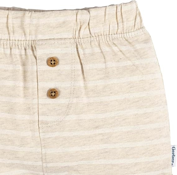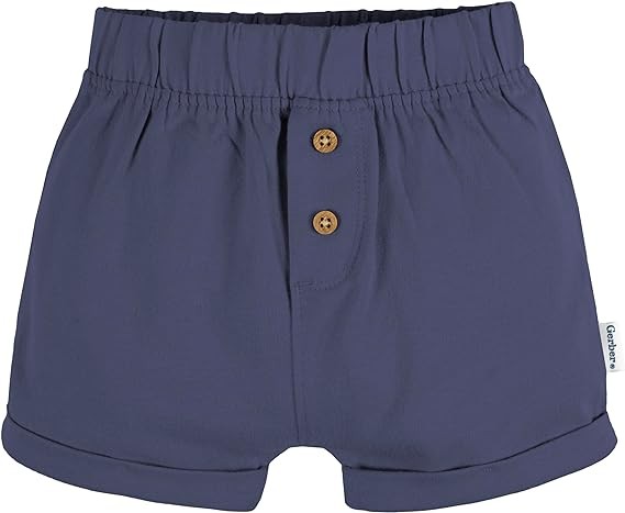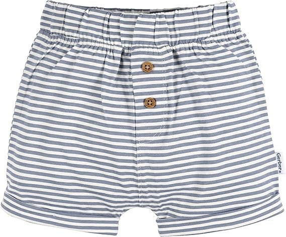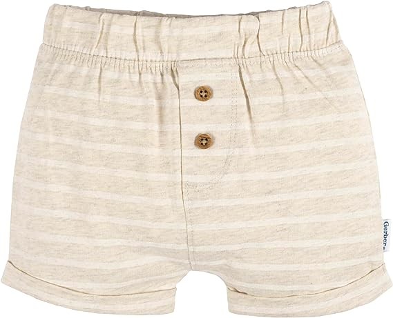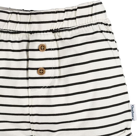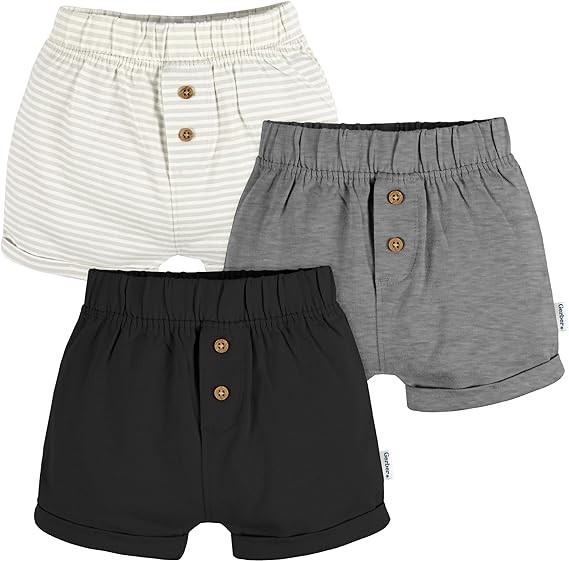 • 2 pair of solid shorts with faux wood buttons and 1 pair of striped shorts with faux wood buttons