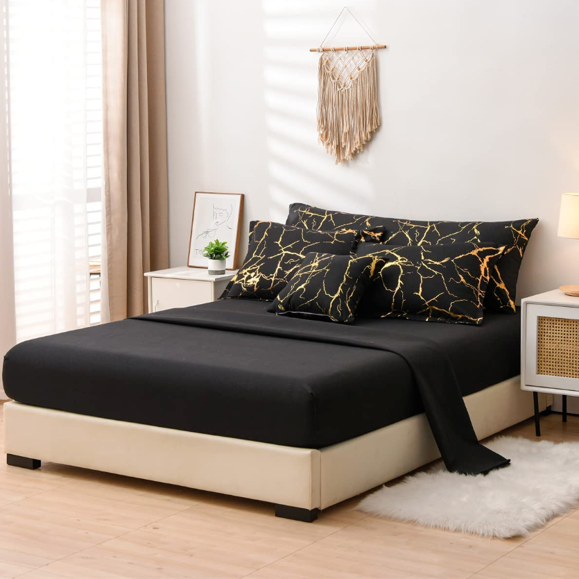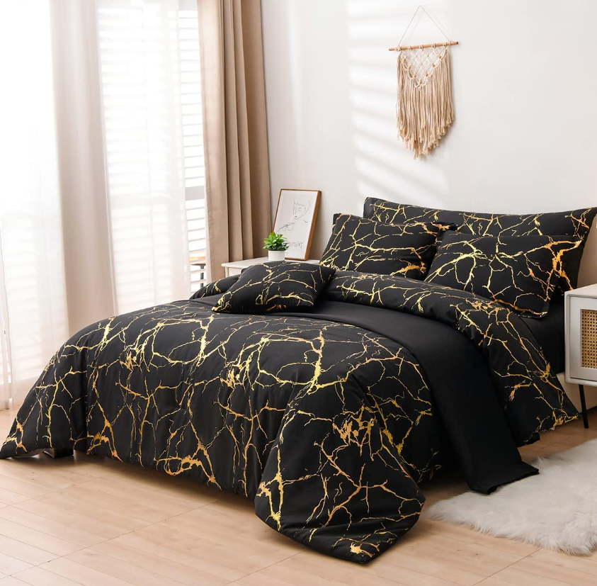 Gold Metallic Marble Comforter and Sheet Set 7Pcs King Size Bed-In-A-Bag Glitter Bedding Sets (Black, King)