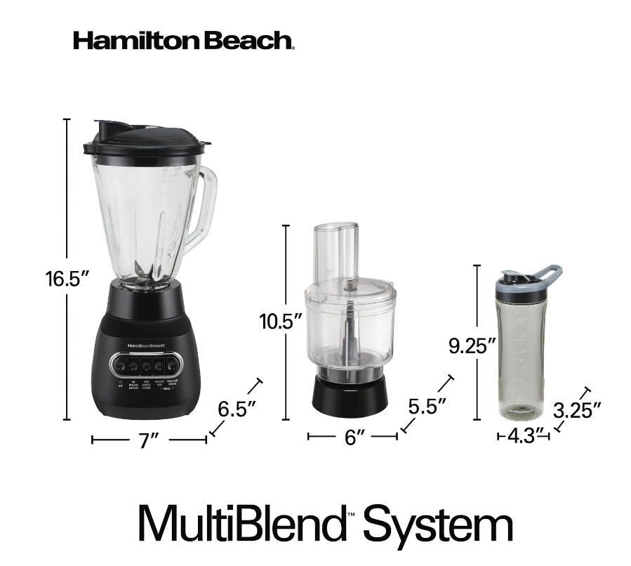 The versatile Hamilton Beach Multi Blend Kitchen System does the work of 3 separate appliances: a traditional kitchen blender, a food processor, and a personal blender. It has a powerful motor with 800 watts of peak power that crushes ice, blends, mixes, chops, slices, shreds and more. A single Multi Blend Blade System handles all your blending and food processing needs. Just choose the right attachment: the 52 oz. glass Multi Blend Jar, the 20 oz. personal jar for single-serve smoothies and shakes, or the food processor attachment with an included slicing and shredding disc. Use the 52 oz. glass blending jar with drip-free pouring spout to make a batch of milkshakes or to puree fresh pasta sauce. Or, swap the jar for the 3-cup food processor attachment to chop vegetables or mince garlic for a stir fry; it includes a chute and food pusher to make adding foods easy. The single-serve 20 oz. travel jar is perfect for morning smoothies when you're in a hurry. It's BPA free and includes a leak-proof lid for drinking on the go. Designed for quieter blending, the Hamilton Beach? Multi Blend Kitchen System is easy to operate, with all the power you need and simple controls. Hamilton Beach Multi Blend Kitchen System, 3-in-1 Blender with Food Processor Attachment, 52 oz. Blending Jar, and 20 oz. Travel Jar, 58176: