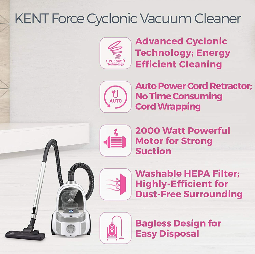 KENT Force Cyclonic Vacuum Cleaner 2000-Watt (White and Silver)