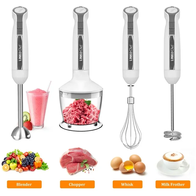 Upgraded 5-In-1 New hand blender customization and ergonomic handle including immersion blender, 500 ml chopper, 600 ml beaker, milk frother, blade shape chopper blade, and egg whisk. A variety of attachments can not only meet your needs for the variety of foods you make but also improve your cooking skills.