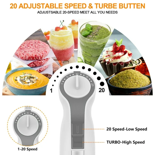 • 【20 Speeds Stick Blender】Find the right speed for every mixing task. Also, you can slowly increase the speed for optimal mixing consistency and avoiding clutter. For difficult mixing tasks, the TURBO button increases the mixer to its maximum speed.