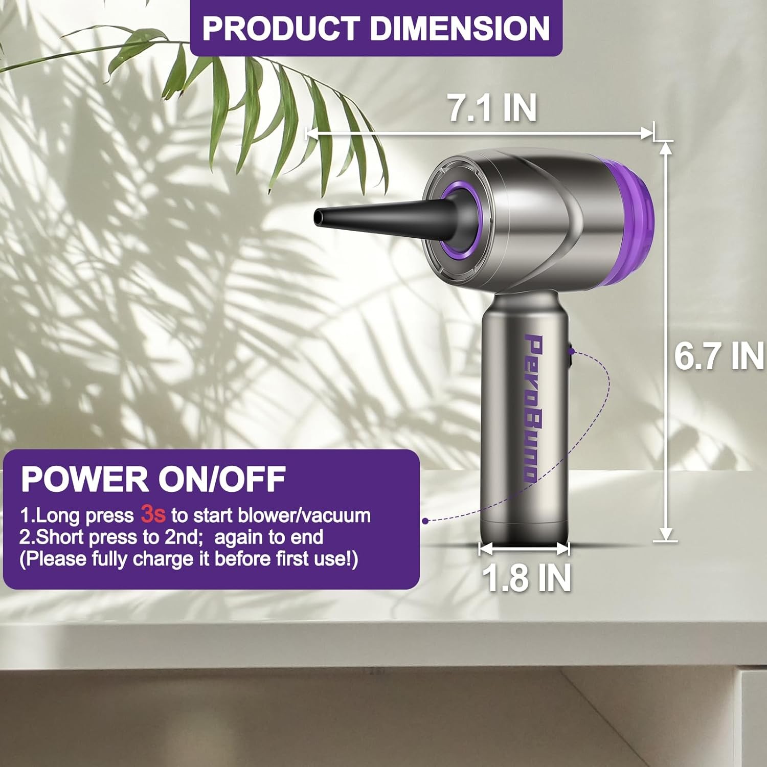 【 Powerful Brushless Motor with 2 Speeds 】- PeroBuno compressed air duster has a powerful brushless motor that ensures high efficiency and durability. It offers 2 speeds, 160000RPM and 90000RPM, brings super airflow. It is an ideal cleaning tool for home, office and car dust cleaning. Nice gift for your family members or friends.