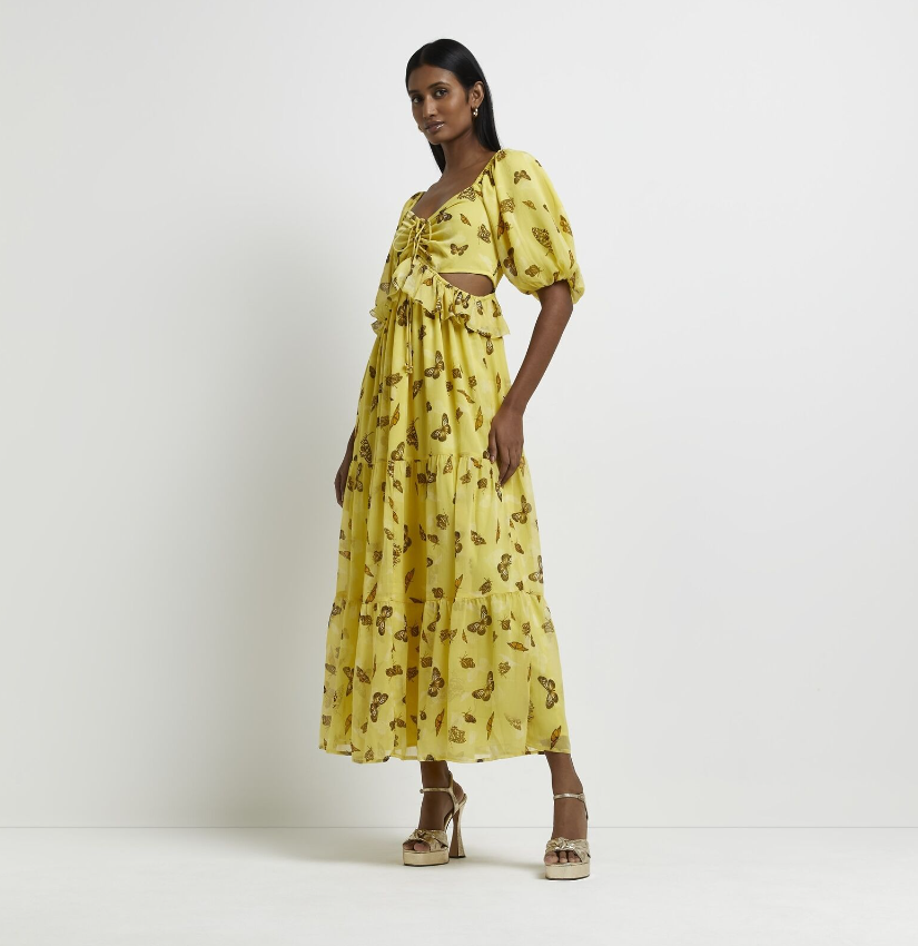 River Island Womens Maxi Dress Yellow Print Cut Out Stylish Short Sleeves