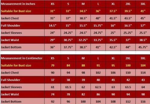 Please select your jacket according to the sizing charts mentioned in picture gallery. We charge additional GBP 15 for sizes above 2XL and custom orders.
